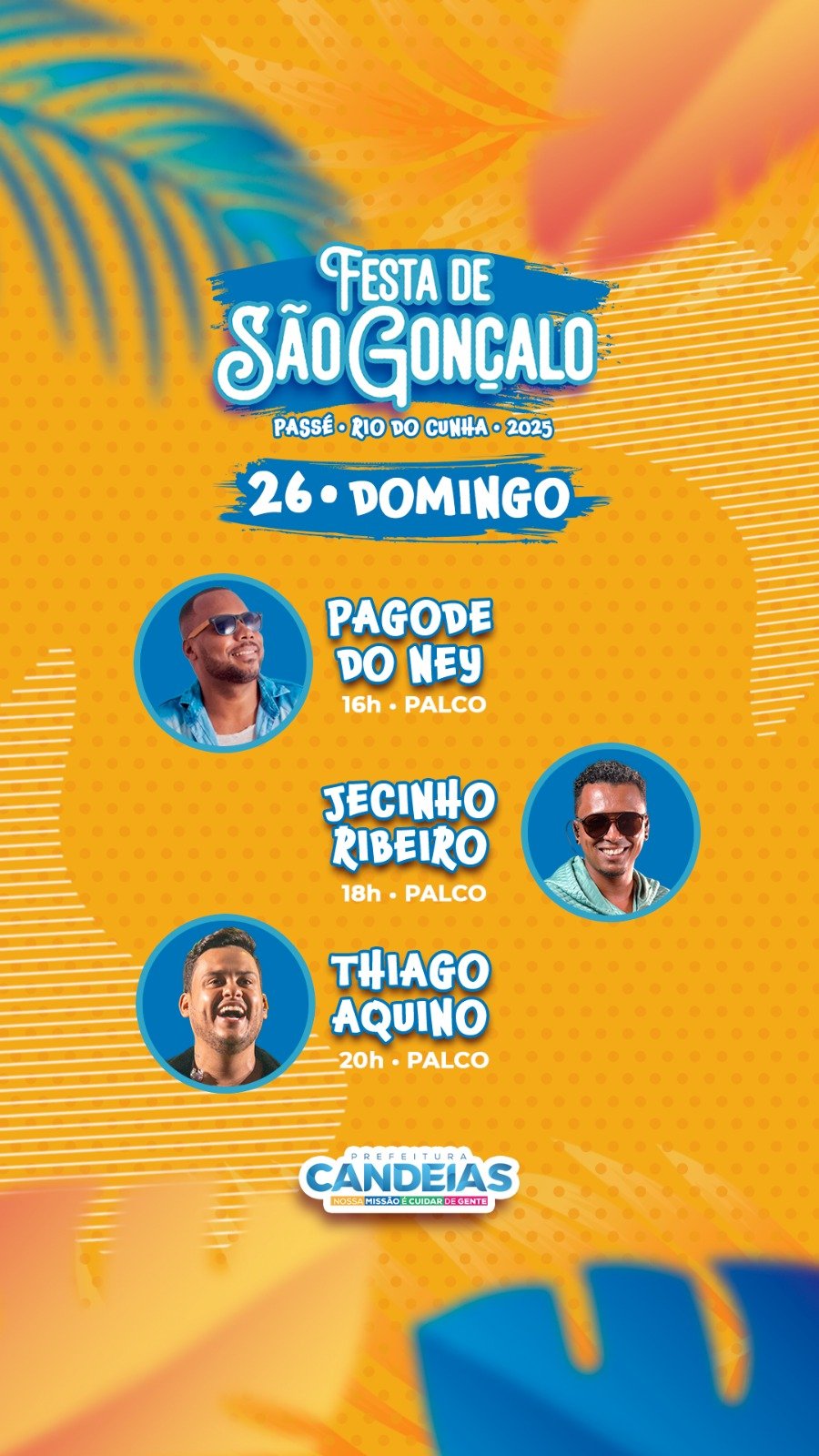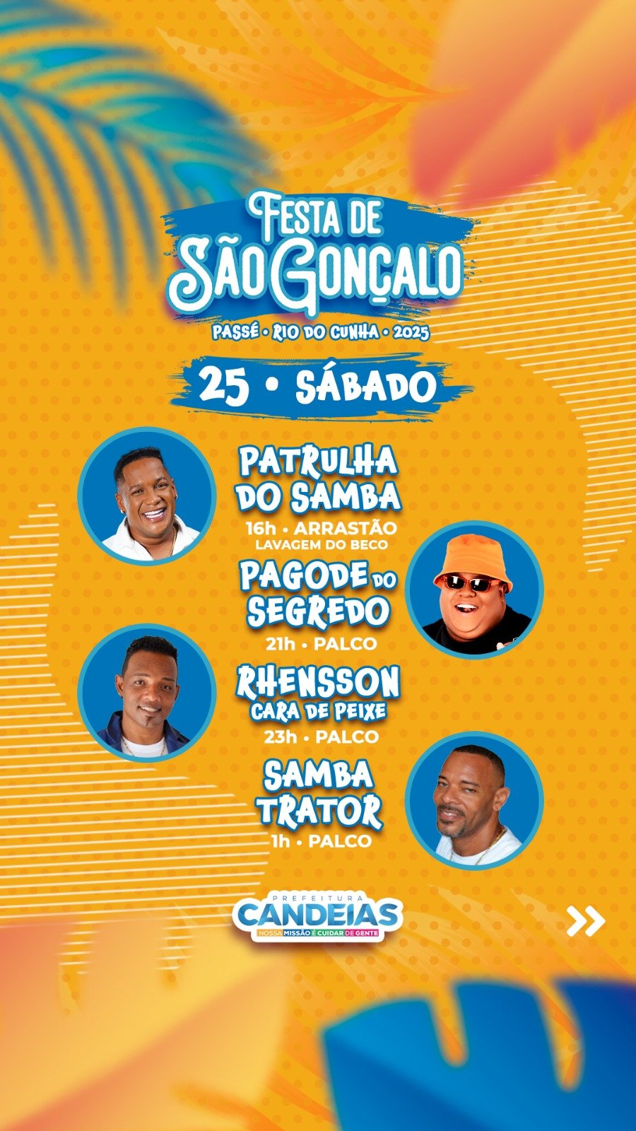A celebração realizada pela Prefeitura de Candeias será nos dias 25 e 26, na Praça do Rio do Cunha. O evento contará ainda com shows de Patrulha do Samba, Samba Trator e os artistas locais Rhensson Cara de Peixe e Pagode do Ney.