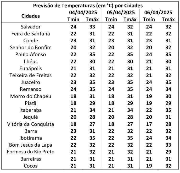 No Estado, a temperatura mínima deve ser de 18 graus em Morro do Chapéu, Piatã e Vitória da Conquista e a máxima deve atingir 37 graus em Itaberaba, Ibotirama, Juazeiro e Remanso.