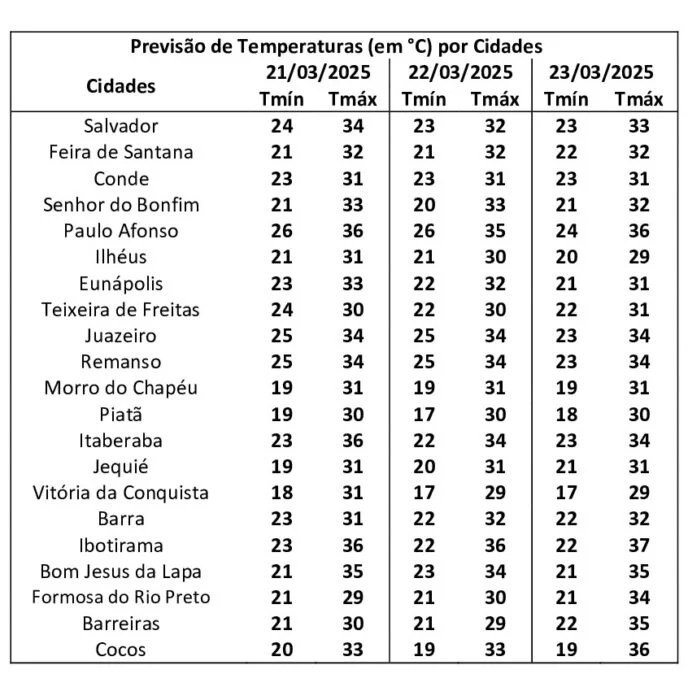 No Estado, a temperatura mínima deve ser de 17 graus em Piatã e Vitória da Conquista e a máxima deve atingir 37 graus em Itaberaba e Ibotirama.