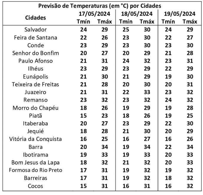 No Estado, a temperatura mínima deve ser em Piatã com 15 graus e Barreiras e Formosa do Rio Preto 17 graus e a máxima em deve atingir em Barra 35 graus Bom Jesus da Lapa e Ibotirama com 34 graus.