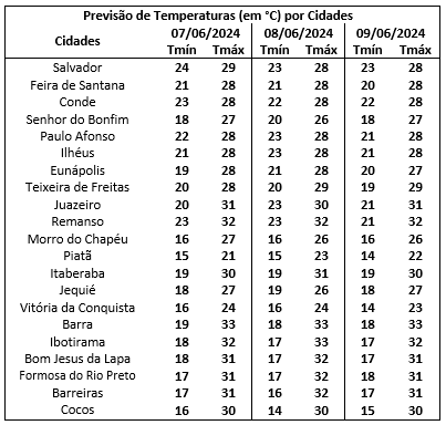 No Estado, a temperatura mínima deve ser em Cocos, Morro do Chapéu, Vitória da Conquista com 16 graus e a máxima em deve atingir em Barra e Ibotirama com 33 graus.