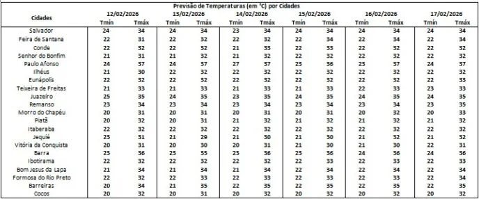 No Estado, a temperatura mínima deve ser de 20 grau em Barreiras, Cocos, Morro do Chapéu e Vitória da Conquista e e a máxima deve atingir 37 graus Paulo Afonso.