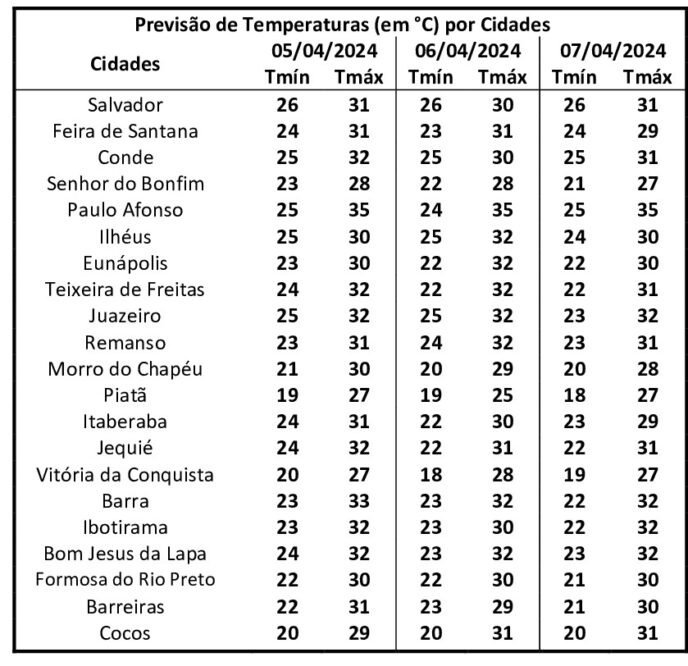 No Estado, a temperatura mínima deve ser em Piatã e Vitória da Conquista de 18 graus e a máxima em deve atingir em Paulo Afonso os 35 graus.