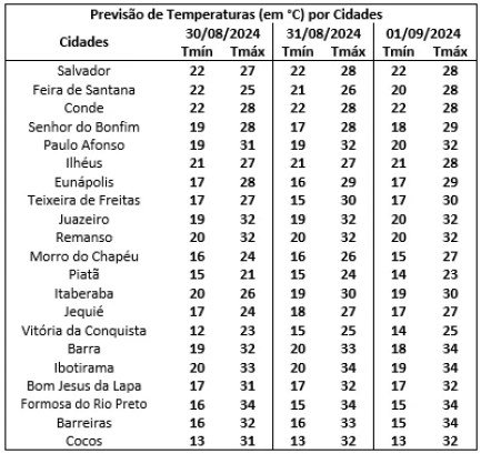 No Estado, a temperatura mínima deve ser de 12 Vitória da Conquista 13 graus em Cocos e a máxima deve atingir 34 graus em Barra, Barreiras, Formosa e Vitória de Conquista.