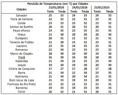 No Estado, a temperatura mínima deve ser de 17 em Vitória da Conquista e a máxima deve atingir 35 graus Juazeiro e Ibotirama.
