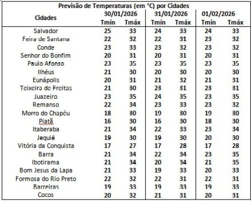 No Estado, a temperatura mínima deve ser de 16 em Piatã e 17 em Vitória da Conquista e a máxima deve atingir 35 graus Barra, Ibotirama, Juazeiro e Paulo Afonso.