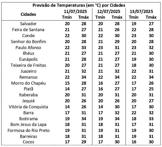 Segundo o Inema (Instituto do Meio Ambiente e Recursos Hídricos da Bahia) informou que nesta sexta-feira, 11/7, devido a formação de cavados, próximos a costa da Bahia, a previsão para o Litoral é de tempo instável e com chuva isolada intercalando com aberturas de sol no decorrer do período. Em Salvador, Região Metropolitana e Recôncavo, segue com variação de nebulosidade com possibilidade de chuvas isoladas no decorrer do período. As temperaturas vão variar entre 20°C a 28°C.