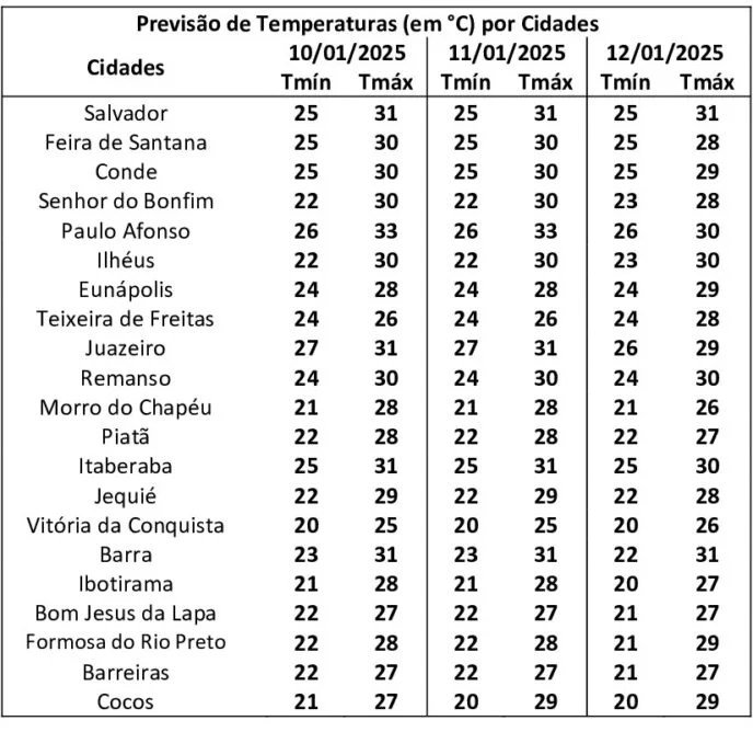 No Estado, a temperatura mínima, no fim de semana, deve ser de 20 graus em Cocos e Vitória da Conquista e a máxima deve atingir 31 graus em Barra, Itaberaba, Juazeiro e Salvador.