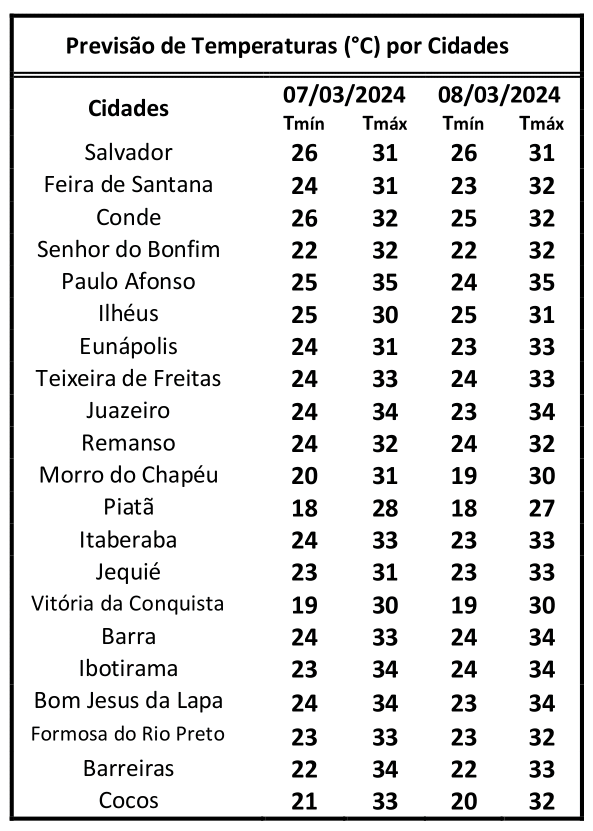 No Estado, a temperatura mínima deve ser de 18 graus em Piatã e a máxima deve atingir 35 graus em Paulo Afonso.