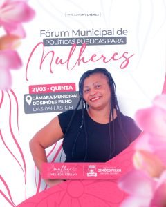 Dando continuidade às atividades em alusão ao mês da mulher, a Prefeitura de Simões Filho, realiza nesta quinta-feira (21), às 09h, na Câmara de Vereadores, o Fórum Municipal de Políticas Públicas para Mulheres. Neste ano, a campanha tem como tema central: “Mulher Seja sua Melhor Versão”.