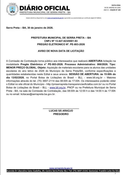Serra Preta – BA, 30 de janeiro de 2026. PREFEITURA MUNICIPAL DE SERRA PRETA – BA CNPJ Nº 13.627.823/0001-93 PREGÃO ELETRONICO Nº. PE-003-2026 AVISO DE NOVA DATA DE LICITAÇÃO A Comissão de Contratação torna público aos interessados que realizará ABERTURA licitação na modalidade Pregão Eletrônico n° PE-003-2026. Processo Administrativo: 066/2026. Tipo: MENOR PREÇO GLOBAL. Objeto: Aquisição de materiais escolares para os alunos das unidades escolares do ano letivo de 2026 do Município de Serra Preta/BA, conforme especificações e quantidades estabelecidas neste Edital e seus anexos. SESSÃO DE ABERTURA: às 15:00h do dia 13/02/2026, no Portal Bolsa de Licitações do Brasil – BLL – www.bll.org.br – Maiores informações através do tel. (75) 3697-2114 das 08:00h às 17:00h. Os interessados poderão obter o Edital no site oficial do Município – ou no Portal Bolsa de Licitações do Brasil – BLL – www.bll.org.br, PNCP ou na Prefeitura Municipal de Serra Preta – BA, na sala da Comissão de Contratação, das 08:00h às 12:00 h e das 14:00 h às 17:00h ou no email: licitacao@serrapreta.ba.gov.br